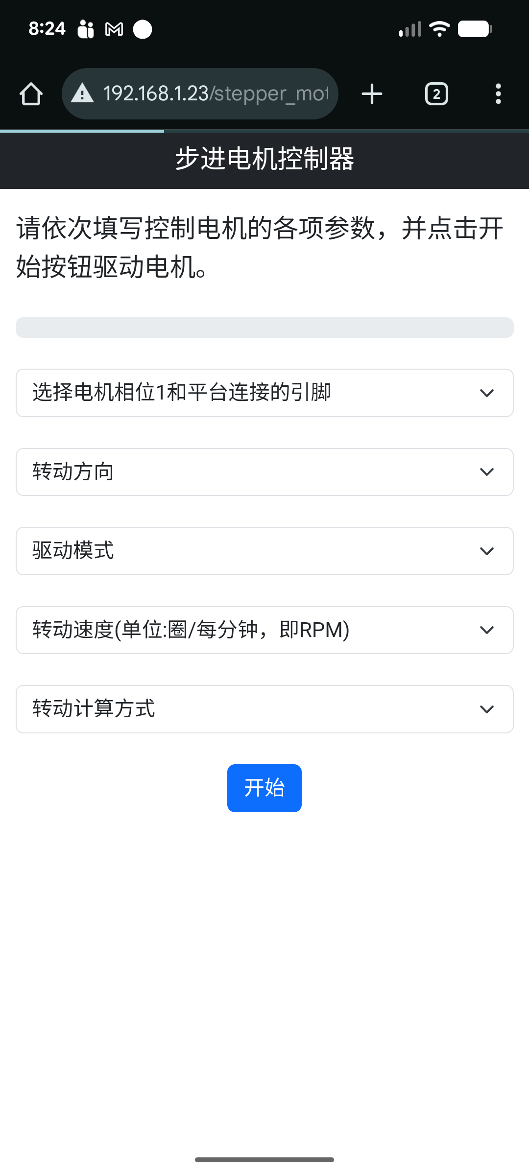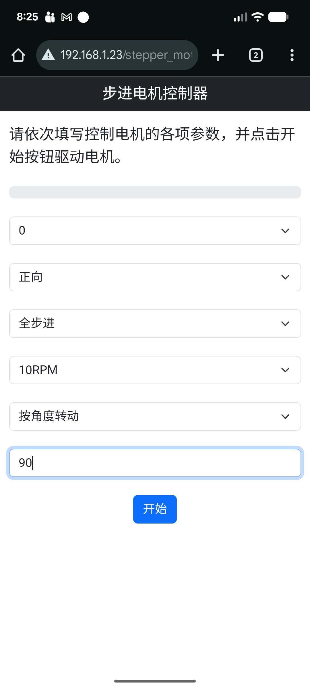 打开创意盒控制台,选择电机类,并加载步进电机应用。进入该应用,选择相位信号(IN1)与平台连接的引脚编号,选择转动方向,驱动模式,速度等参数。然后点击开始,电机会开始转动。